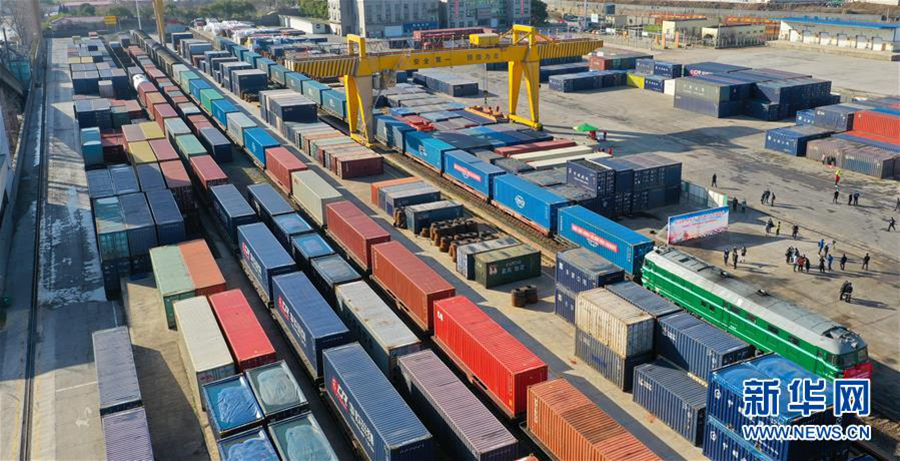 2月17日,中歐班列(南昌)在南昌向塘鐵路口岸等待發(fā)車(chē)(無(wú)人機(jī)照片)。 新華社記者 胡晨歡 攝