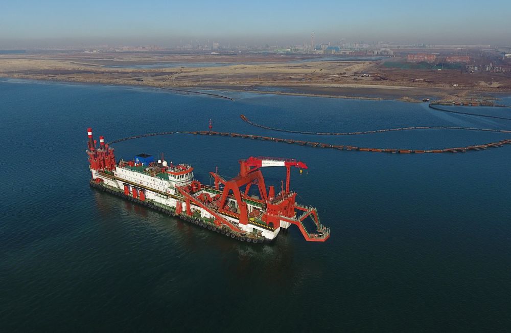 3月14日,一艘施工船在唐山港京唐港區(qū)25萬噸級航道工程海域施工作業(yè)(無人機(jī)拍攝)。新華社記者楊世堯攝