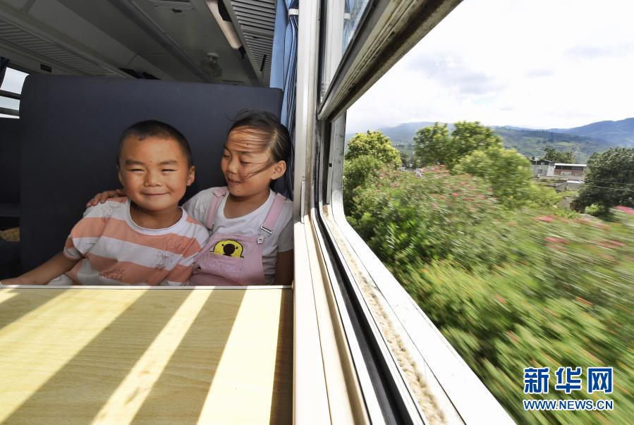 2020年8月14日,吳思語(右)帶著弟弟吳思遠(yuǎn)乘坐“小慢車”前往西昌走親戚。穿越四川涼山彝族自治州往返于普雄和攀枝花之間的5633/5634次列車,全列13節(jié)車廂,走滿全程353公里需要9個多小時。慢悠悠的火車沿途要???6個站,如同一座流動的村莊,盡自己最大能力解決沿途百姓出行問題。