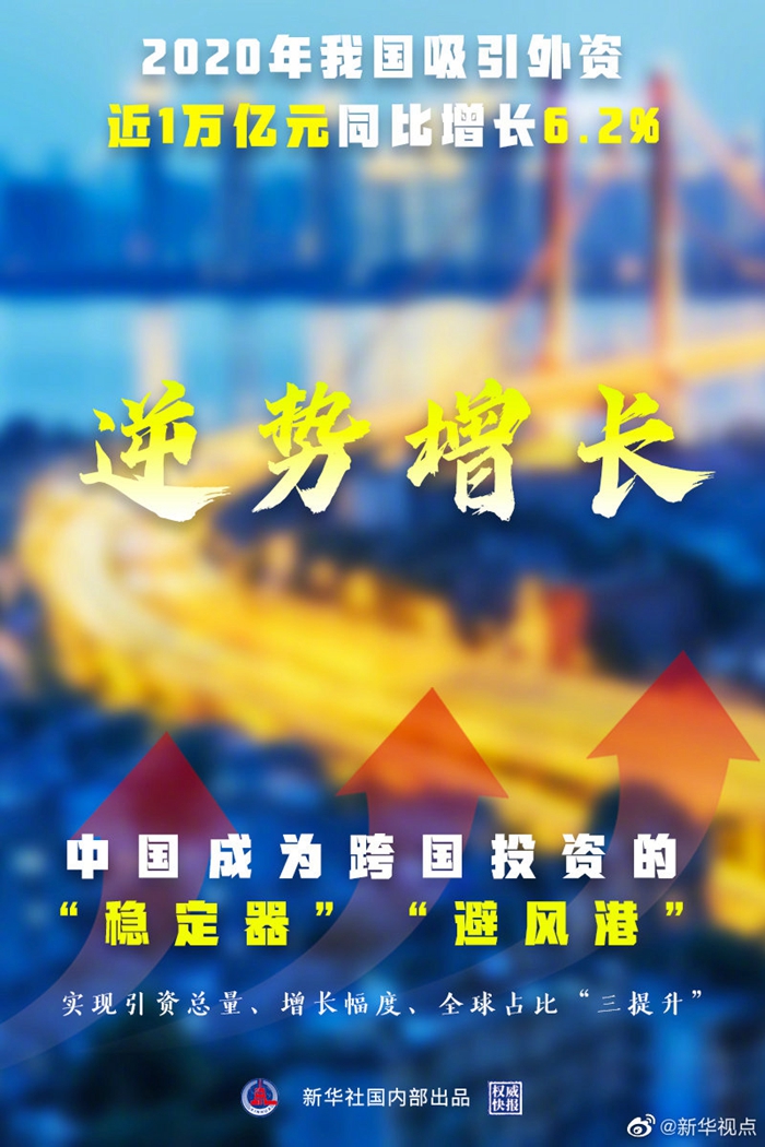 新冠肺炎疫情沖擊下,全球跨國投資大幅下降,中國引資卻逆勢增長。商務部1月20日發(fā)布數據顯示,2020年我國非金融領域實際使用外資9999.8億元人民幣,同比增長6.2%,實現了引資總量、增長幅度、全球占比“三提升”。中國成為跨國投資的“穩(wěn)定器”和“避風港”。(記者于佳欣)?