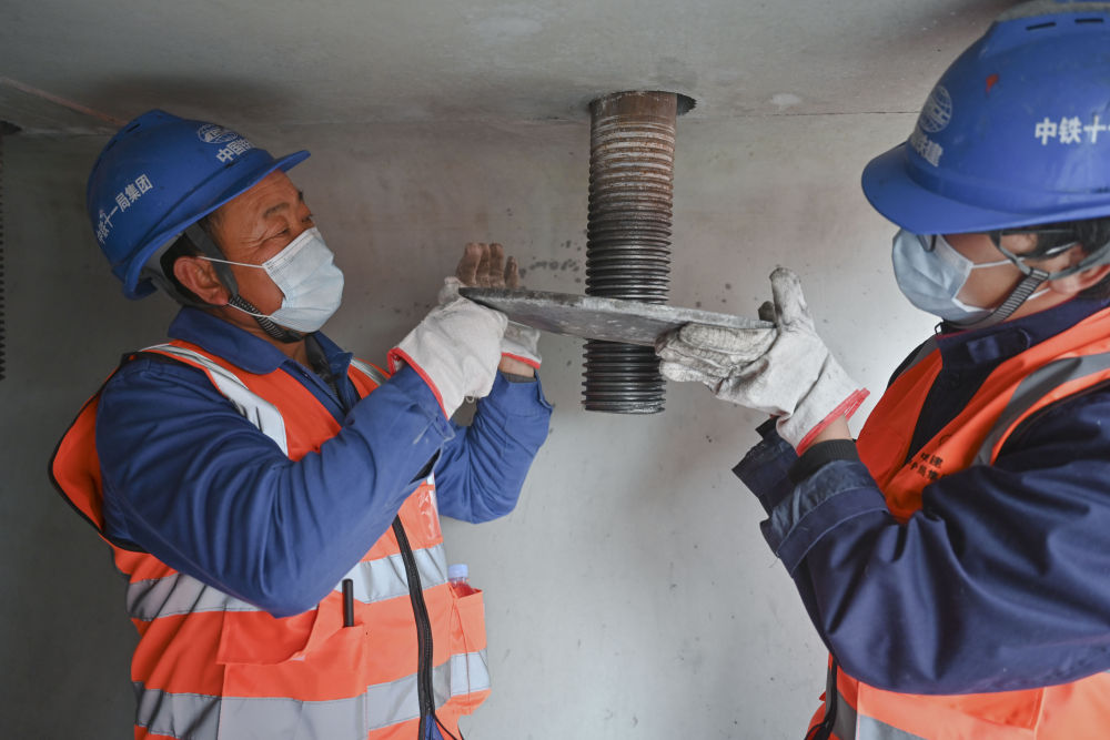 1月28日,杜學(xué)剛(右)和工友爬進箱梁,準備拆卸提梁固定螺栓。