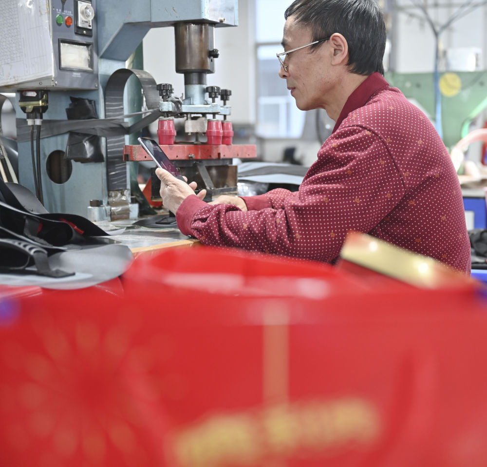 在工廠工作了十多年的張良國將領(lǐng)到的年貨拍成照片,發(fā)給遠在四川老家的兒子,告訴家人這里一切都好。