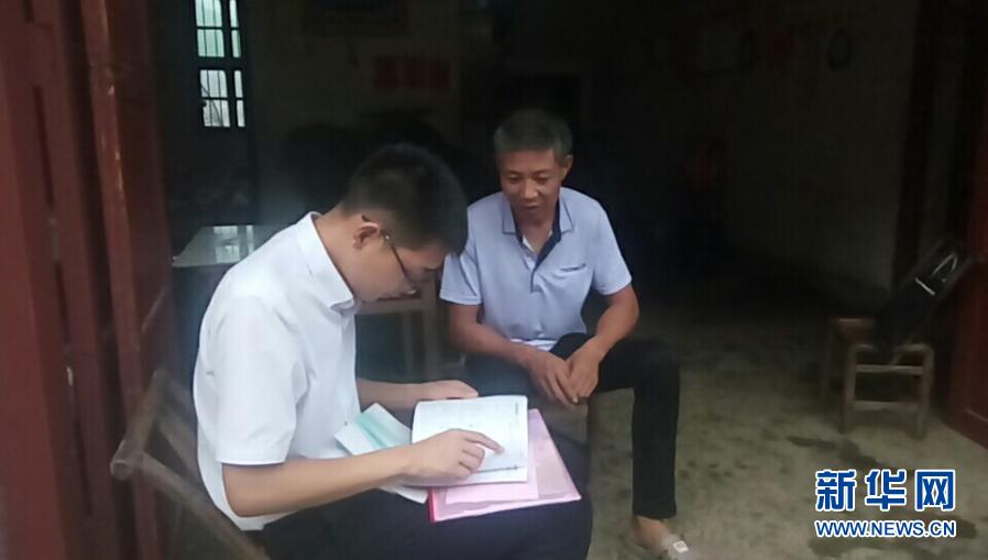吳應譜(左)在走訪貧困戶(資料照片)。新華社發(fā)(修水縣委宣傳部供圖)