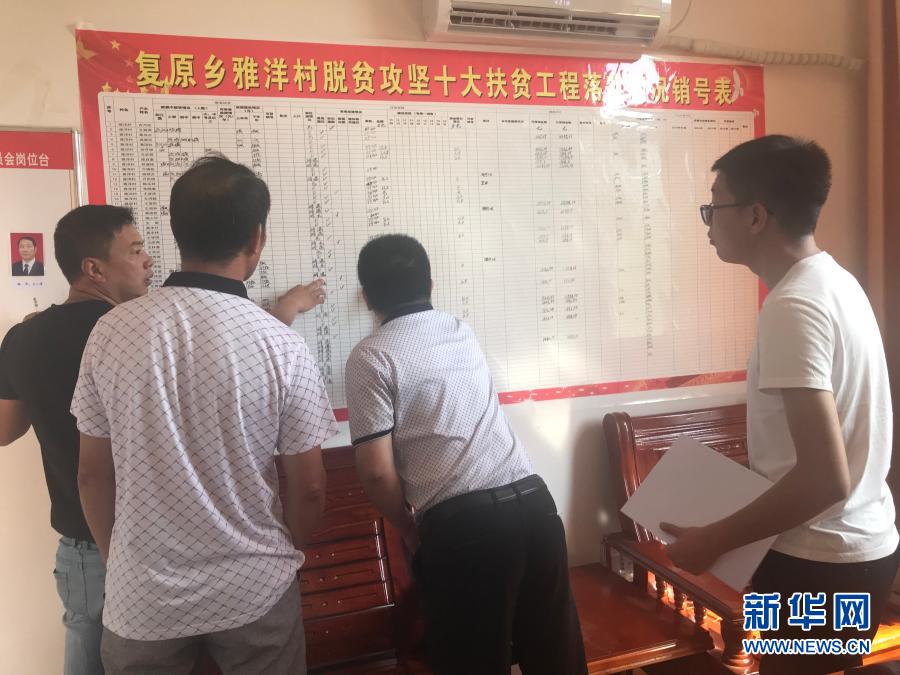 吳應譜(右一)在雅洋村和同事研究扶貧工程落實情況(資料圖片)。新華社發(fā)(修水縣委宣傳部供圖)