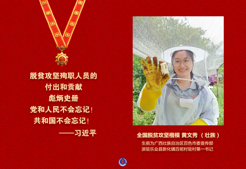 黃文秀同志把青春和熱血都獻(xiàn)給了脫貧攻堅(jiān)事業(yè),以實(shí)際行動(dòng)詮釋了共產(chǎn)黨人的初心和使命,用短暫而精彩的人生譜寫了一曲新時(shí)代共產(chǎn)黨員的奉獻(xiàn)之歌。2019年6月17日犧牲在脫貧攻堅(jiān)一線,年僅30歲。