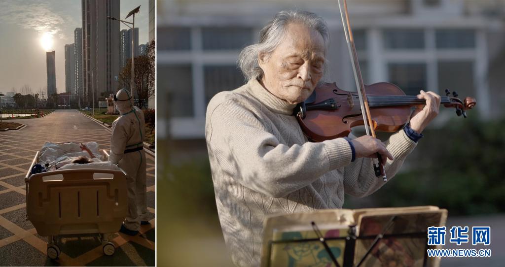 這是一張拼版照片,左圖為:2020年3月5日傍晚,在湖北省武漢大學人民醫(yī)院東院,復旦大學附屬中山醫(yī)院支援湖北醫(yī)療隊醫(yī)生在護送患者王欣做CT的途中停下,讓住院近一個月的老人欣賞久違的日落(甘俊超 攝);右圖為:3月24日,“看夕陽的老人”王欣在東西湖區(qū)園藝花城小區(qū)內拉小提琴(新華社記者熊琦攝)。新華社發(fā)