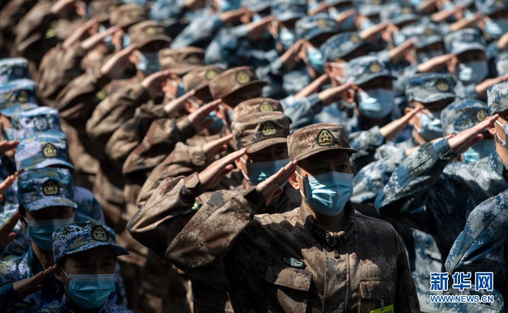2020年4月15日,最后一批回撤的軍隊支援湖北醫(yī)療隊隊員向火神山醫(yī)院敬禮告別。新華社記者 費茂華 攝