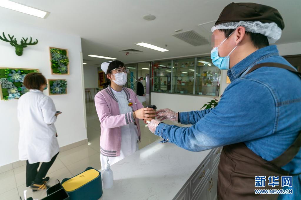 在上海市楊浦區(qū)精神衛(wèi)生中心開了一家名叫“Healing Coffee”的咖啡店,三名已出院的患者輪流擔(dān)任調(diào)制咖啡、收銀、結(jié)算的工作??Х鹊隇樾l(wèi)生中心的工作人員提供咖啡等飲品。這是見習(xí)咖啡師沐枝為醫(yī)護(hù)人員送上制作好的咖啡(2020年12月3日攝)。新華社記者 王翔 攝