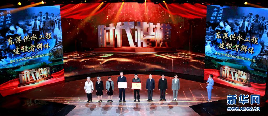 東深供水工程建設者群體代表在“時代楷?!卑l(fā)布儀式上領取“時代楷?!豹勁坪妥C書(2021年4月18日攝)。新華社記者 潘旭 攝