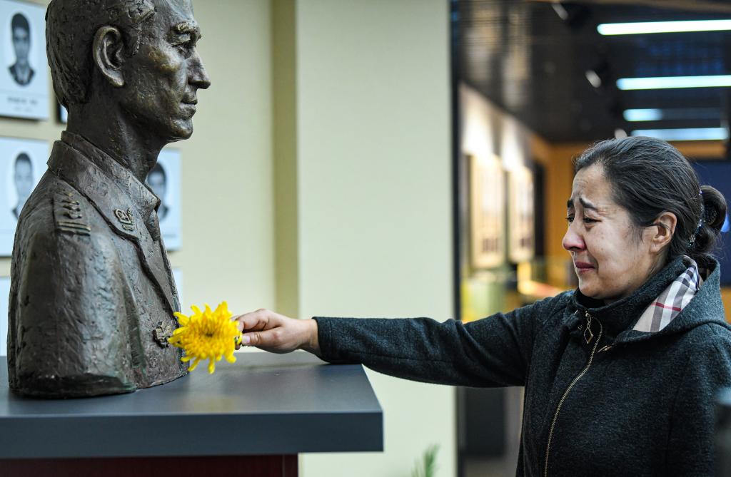 2021年4月3日,在新疆警史館,瑪依努爾在愛(ài)人艾熱提的雕像前擺上菊花。新華社記者 王菲 攝