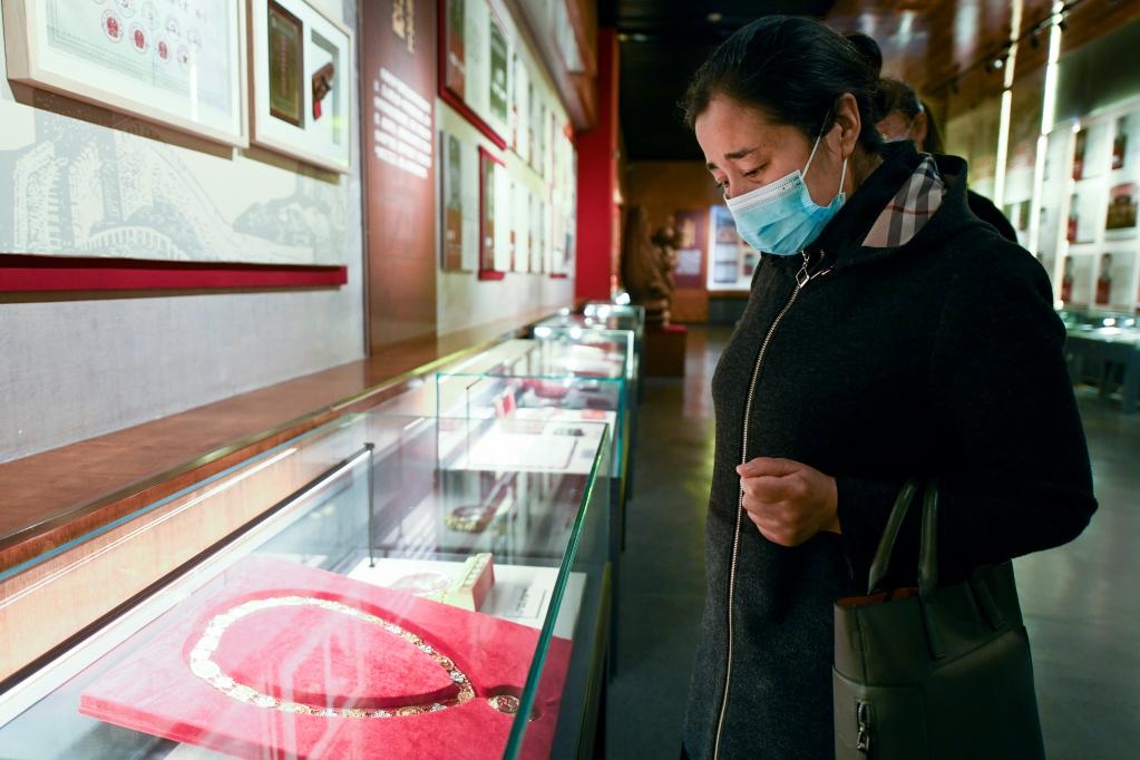 2021年4月3日,在烏魯木齊市革命烈士陵園,瑪依努爾看著愛(ài)人艾熱提的獎(jiǎng)?wù)孪萑肷钏?。新華社記者 王菲 攝