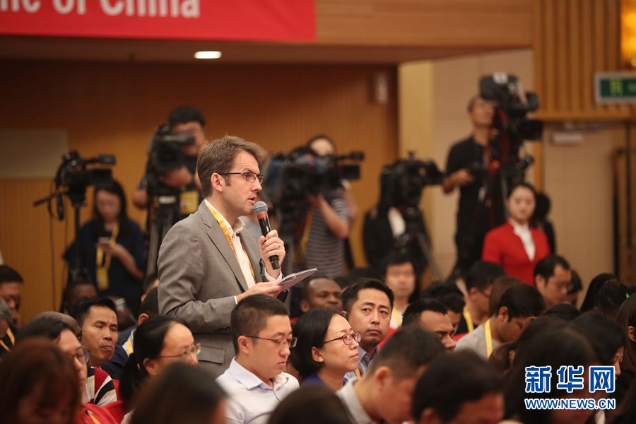 9月24日,慶祝中華人民共和國成立70周年活動新聞中心在北京梅地亞中心二層新聞發(fā)布廳舉辦第一場新聞發(fā)布會。圖為境外媒體記者提問。新華網(wǎng)記者 陳競超 攝