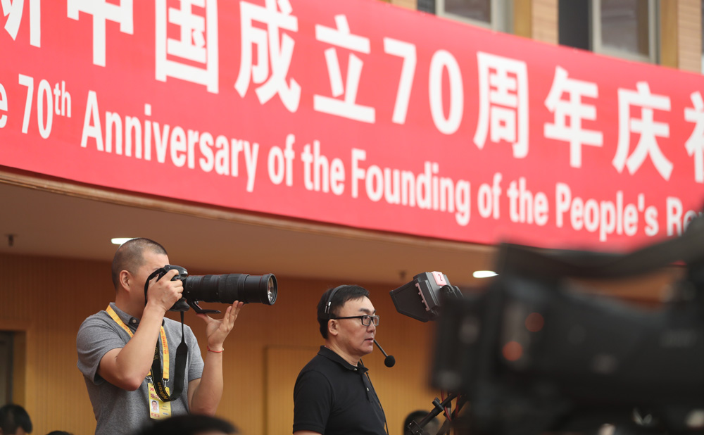 9月27日,慶祝中華人民共和國成立70周年活動新聞中心在梅地亞中心二層新聞發(fā)布廳舉辦第三場新聞發(fā)布會,中央農(nóng)村工作領(lǐng)導(dǎo)小組辦公室主任、農(nóng)業(yè)農(nóng)村部部長韓長賦,國務(wù)院扶貧開發(fā)領(lǐng)導(dǎo)小組辦公室主任劉永富介紹全面建成小康社會,扎實推進脫貧攻堅和鄉(xiāng)村振興,并回答記者提問。圖為采訪拍攝發(fā)布會的記者。新華網(wǎng) 陳杰 攝