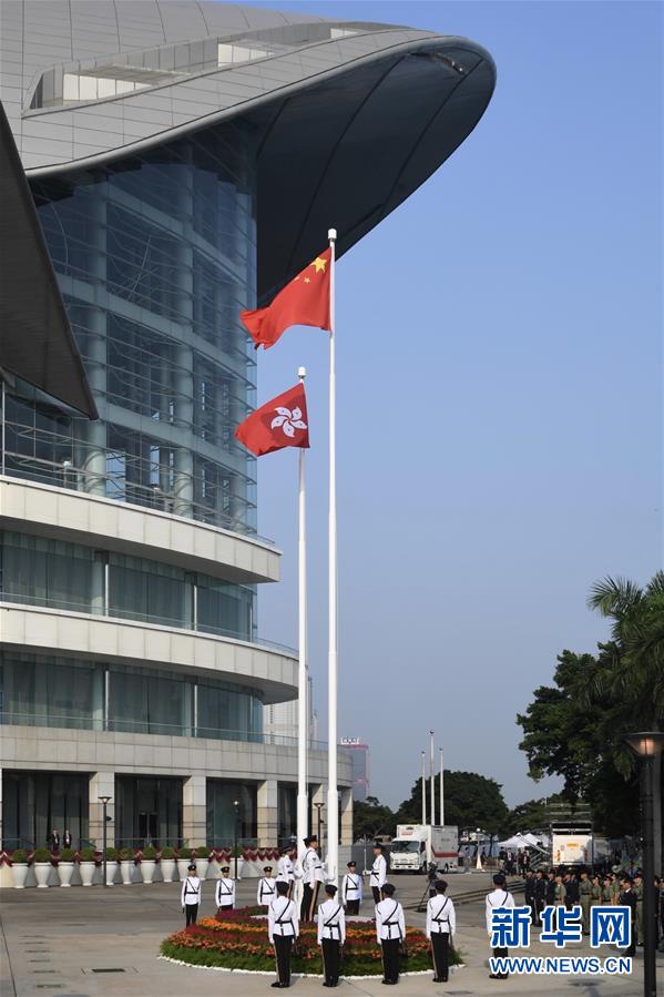 新華社香港10月1日電(記者劉明洋)慶祝中華人民共和國成立70周年升旗儀式暨國慶酒會1日上午分別在金紫荊廣場及香港會議展覽中心舉行。香港特區(qū)署理行政長官張建宗、中央駐港機構負責人等嘉賓及特區(qū)政府官員、行政會議成員、外國使節(jié)、社會各界人士等近2000人,在會展中心內(nèi)通過大屏幕直播觀禮。
