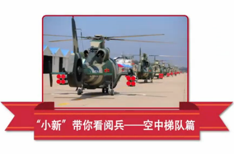 方隊(duì)由26架直升機(jī)和7架教練機(jī)組成。國(guó)旗和軍旗分別由1架直升機(jī)在正下方懸掛、由2架直升機(jī)護(hù)衛(wèi),組成兩組三機(jī)梯隊(duì),呈品字形依次通過。緊隨其后的是由20架直升機(jī)組成“70”字樣,寓意中華民族以抗戰(zhàn)勝利為起點(diǎn)走向偉大復(fù)興的征程。這是我國(guó)在閱兵中首次采用紀(jì)念數(shù)字的編隊(duì)飛行。