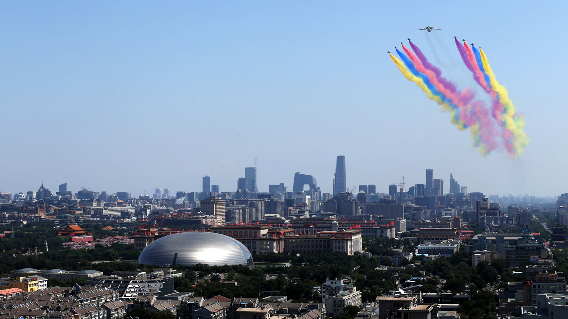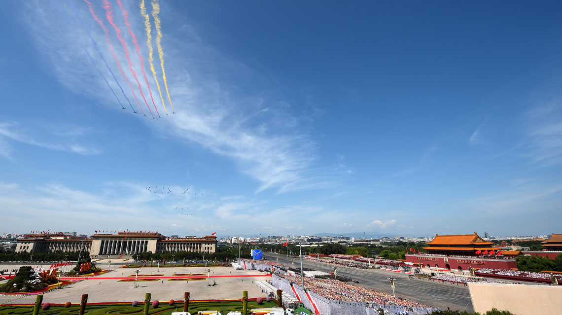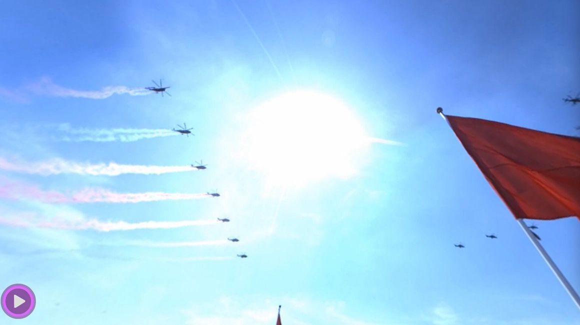 蔚藍(lán)的天空中,6架直升機(jī)護(hù)衛(wèi)著國(guó)旗和軍旗、20架直升機(jī)飛成“70”字樣、7架教練機(jī)拉出7道彩煙——率先從天安門廣場(chǎng)飛過的空中護(hù)旗方隊(duì),揭開了勝利日大閱兵的序幕。9月3日,雄偉的天安門,寬闊的長(zhǎng)安街,見證著這場(chǎng)大閱兵的一個(gè)又一個(gè)精彩瞬間。