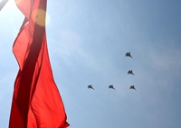 - 空中護(hù)旗方隊(duì)率先飛過天安門上空
