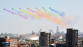 - 領(lǐng)隊(duì)機(jī)梯隊(duì)飛過天安門 8道彩煙絢麗奪目