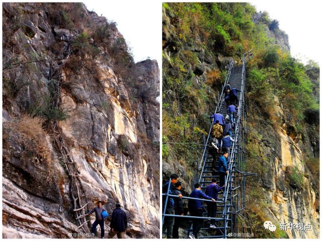 過(guò)去,“懸崖村”的村民們進(jìn)出村子需要攀爬由藤條和木棍編成的17段“天梯”,從山腳下到半山腰只有4公里,卻需要走上5個(gè)小時(shí)?,F(xiàn)在的“天梯”,是用1500根鋼管打造的,讓鄉(xiāng)親們脫貧奔小康的夢(mèng)想不再遙不可及。
