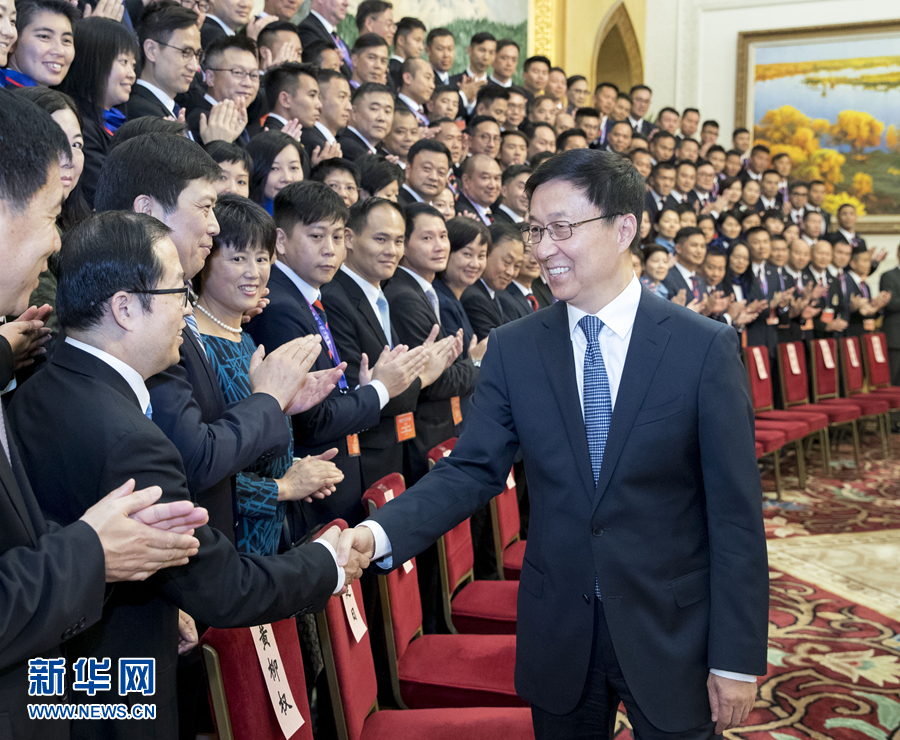 8月27日,中共中央政治局常委、國務(wù)院副總理韓正在北京人民大會堂會見香港特別行政區(qū)保安局局長李家超率領(lǐng)的香港紀(jì)律部隊(duì)文化交流團(tuán)全體成員。 新華社記者王曄攝