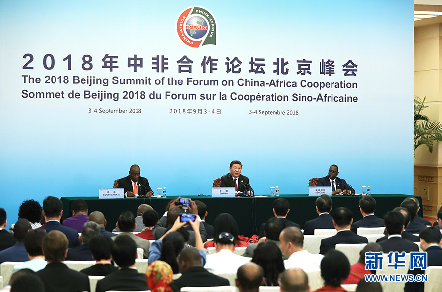 9月4日,2018年中非合作論壇北京峰會(huì)閉幕后,國家主席習(xí)近平同論壇前任共同主席國南非總統(tǒng)拉馬福薩、新任共同主席國塞內(nèi)加爾總統(tǒng)薩勒在北京人民大會(huì)堂共同會(huì)見記者。 新華社記者 劉衛(wèi)兵 攝