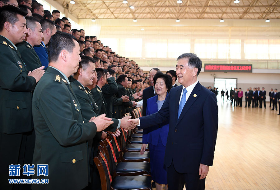 9月19日,中共中央政治局常委、全國(guó)政協(xié)主席、中央代表團(tuán)團(tuán)長(zhǎng)汪洋率代表團(tuán)部分成員分別赴寧夏軍區(qū)、武警寧夏總隊(duì)慰問,并會(huì)見自治區(qū)政法系統(tǒng)代表。這是汪洋慰問武警寧夏總隊(duì)官兵代表。 新華社記者 張領(lǐng) 攝