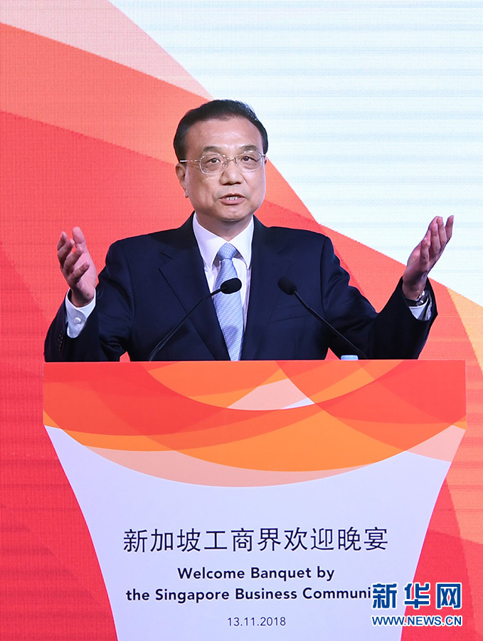 新華社新加坡11月13日電(記者張正富 楊定都)國務(wù)院總理李克強當?shù)貢r間11月13日晚在新加坡出席新加坡工商聯(lián)合總會和中華總商會聯(lián)合舉辦的歡迎晚宴并致辭。