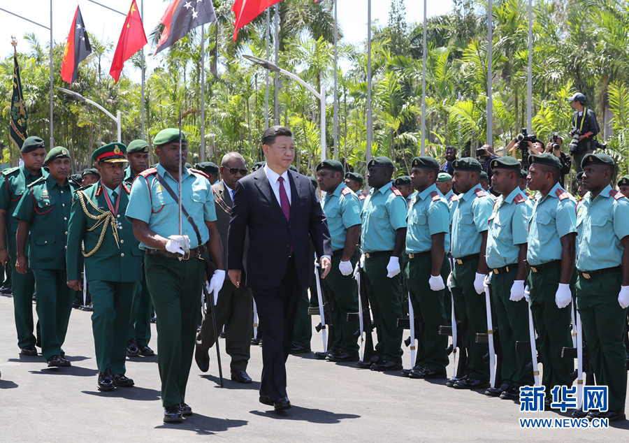 11月16日,國(guó)家主席習(xí)近平在莫爾茲比港會(huì)見巴布亞新幾內(nèi)亞總督達(dá)達(dá)埃。會(huì)見開始前,達(dá)達(dá)埃在議會(huì)大廈前廣場(chǎng)為習(xí)近平舉行隆重歡迎儀式。新華社記者 鞠鵬 攝