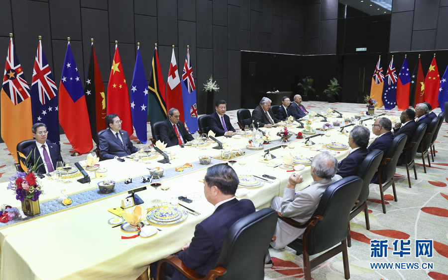 11月16日,國家主席習(xí)近平在莫爾茲比港同巴布亞新幾內(nèi)亞總理奧尼爾、密克羅尼西亞聯(lián)邦總統(tǒng)克里斯琴、薩摩亞總理圖伊拉埃帕、瓦努阿圖總理薩爾瓦伊、庫克群島總理普納、湯加首相波希瓦、紐??偫硭冉ń惶窖髰u國領(lǐng)導(dǎo)人以及斐濟(jì)政府代表、國防部長昆布安博拉舉行集體會(huì)晤。習(xí)近平主持會(huì)晤并發(fā)表主旨講話。 新華社記者 謝環(huán)馳 攝