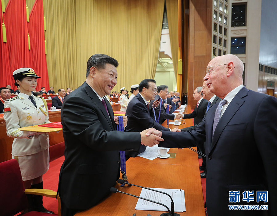 12月18日,慶祝改革開放40周年大會(huì)在北京人民大會(huì)堂隆重舉行。中共中央總書記、國(guó)家主席、中央軍委主席習(xí)近平在大會(huì)上發(fā)表重要講話。這是習(xí)近平等為獲得中國(guó)改革友誼獎(jiǎng)?wù)氯藛T代表頒獎(jiǎng)。 新華社記者 鞠鵬 攝