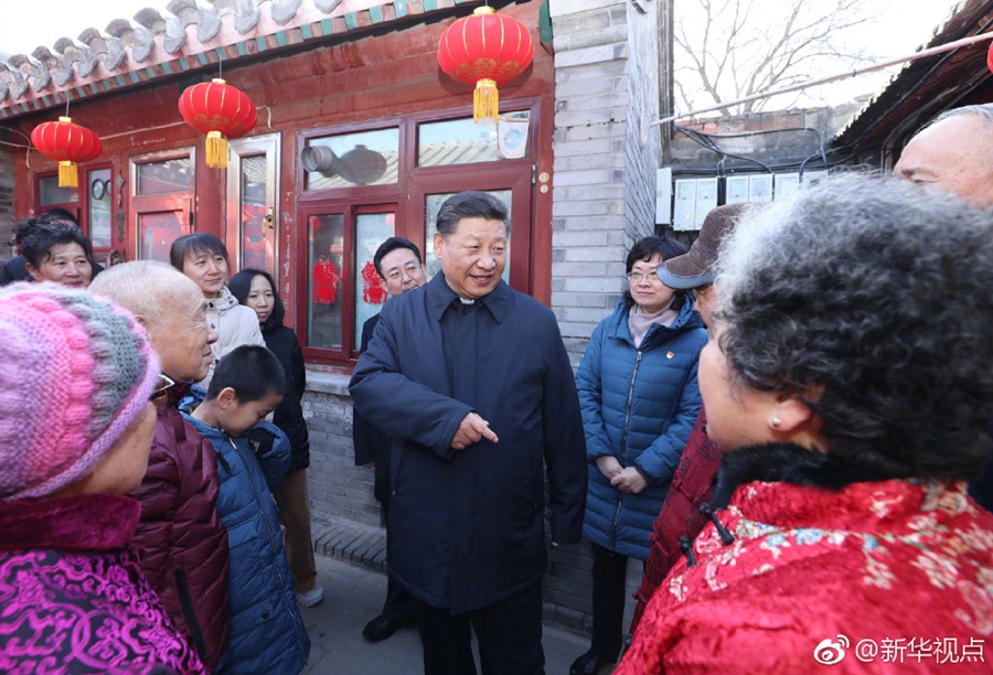 2月1日上午,習(xí)近平來到前門東區(qū),沿草廠四條胡同步行察看街巷風(fēng)貌,聽取區(qū)域規(guī)劃建設(shè)、舊城保護(hù)整治、人居環(huán)境改善等情況介紹,先后走進(jìn)兩個(gè)四合院看望,同這里的居民一起包餃子、炸饹馇、貼“?!弊帧⒘募页?,仔細(xì)詢問住房環(huán)境有沒有改善、年貨備齊沒有、生活還有什么困難,祝他們生活幸福、新春快樂。四合院里笑語歡聲,習(xí)近平對(duì)他們說,中國(guó)共產(chǎn)黨的追求就是讓老百姓生活越來越好。(記者張曉松、鞠鵬)
