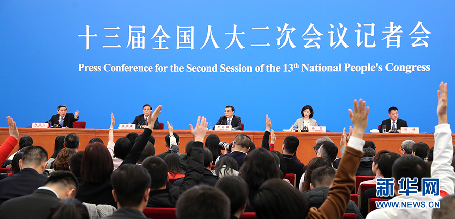 3月15日,國(guó)務(wù)院總理李克強(qiáng)在北京人民大會(huì)堂會(huì)見(jiàn)采訪十三屆全國(guó)人大二次會(huì)議的中外記者并答記者問(wèn)。這是記者舉手提問(wèn)。 新華社記者 殷剛 攝