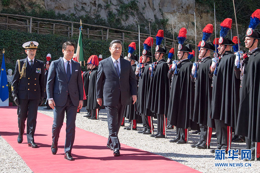 3月23日,國(guó)家主席習(xí)近平在羅馬同意大利總理孔特會(huì)談。這是習(xí)近平抵達(dá)時(shí),孔特總理在停車處迎接。兩國(guó)領(lǐng)導(dǎo)人一同檢閱儀仗隊(duì)。 新華社記者 李學(xué)仁 攝