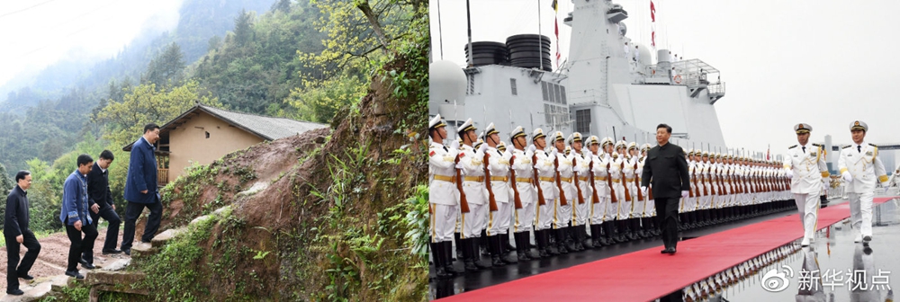 左圖為4月15日下午,在重慶石柱土家族自治縣中益鄉(xiāng)華溪村,習(xí)近平踏著濕滑的石階登上陡坡,前往貧困戶譚登周家看望(謝環(huán)馳攝);右圖為4月23日,習(xí)近平出席慶祝人民海軍成立70周年海上閱兵活動(李剛攝)