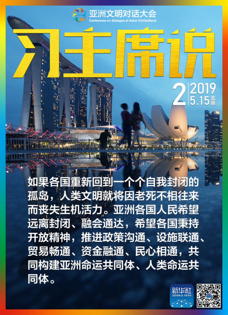 如果各國重新回到一個個自我封閉的孤島,人類文明就將因老死不相往來而喪失生機活力。亞洲各國人民希望遠離封閉、融會通達,希望各國秉持開放精神,推進政策溝通、設施聯(lián)通、貿(mào)易暢通、資金融通、民心相通,共同構建亞洲命運共同體、人類命運共同體。