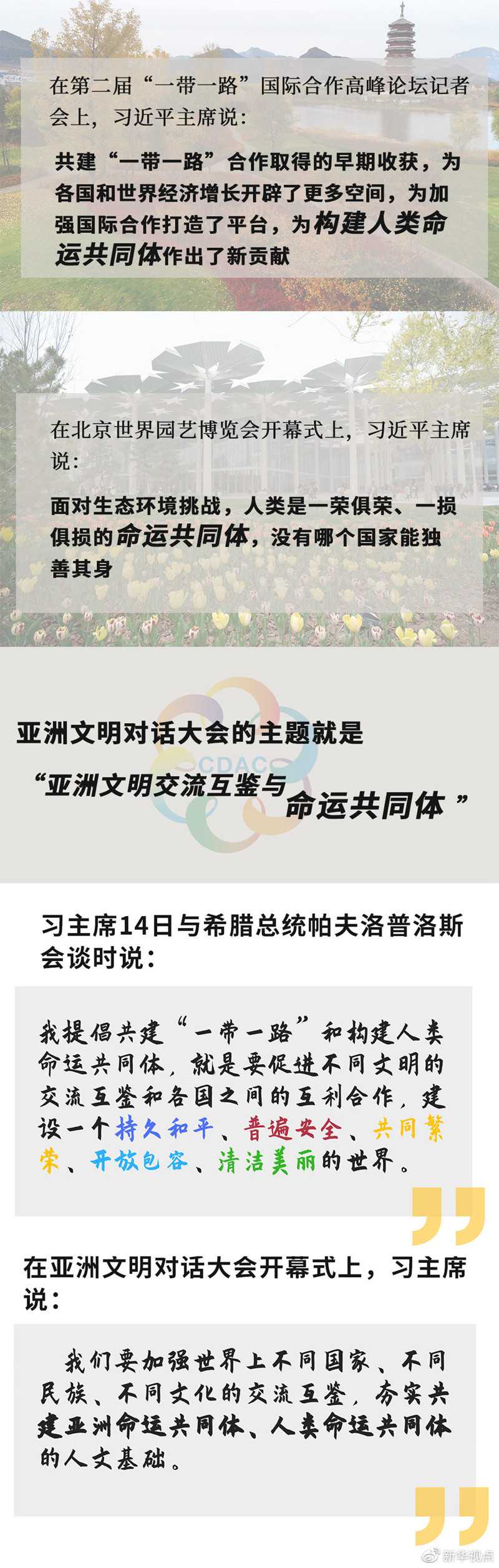 半個(gè)多月來(lái),世界的目光一次次聚焦北京。從第二屆“一帶一路”國(guó)際合作高峰論壇,到2019年中國(guó)北京世界園藝博覽會(huì),再到亞洲文明對(duì)話大會(huì),三場(chǎng)活動(dòng)主題不同,卻有一個(gè)關(guān)鍵詞貫穿始終:命運(yùn)共同體。