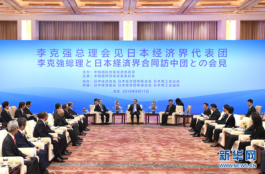 9月11日,國務(wù)院總理李克強(qiáng)在北京釣魚臺國賓館會見日中經(jīng)濟(jì)協(xié)會會長宗岡正二、日本商工會議所會長三村明夫、日本經(jīng)濟(jì)團(tuán)體聯(lián)合會審議員會議長古賀信行率領(lǐng)的日本經(jīng)濟(jì)界代表團(tuán)并同他們座談交流。 新華社記者 饒愛民 攝
