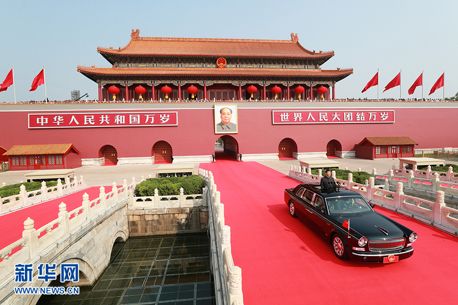 10月1日,慶祝中華人民共和國成立70周年大會在北京天安門廣場隆重舉行。中共中央總書記、國家主席、中央軍委主席習近平發(fā)表重要講話并檢閱受閱部隊。這是習近平乘坐檢閱車,經(jīng)過金水橋,駛上長安街。 新華社記者 龐興雷 攝
