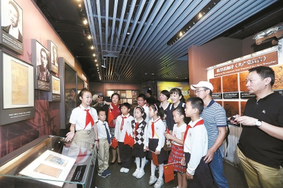 中共一大會(huì)址紀(jì)念館小小講解員、00后潘夢(mèng)婕(左),為觀眾講述《忠誠(chéng)源于信仰——一座衣冠冢的傳奇》。 蔣迪雯 攝