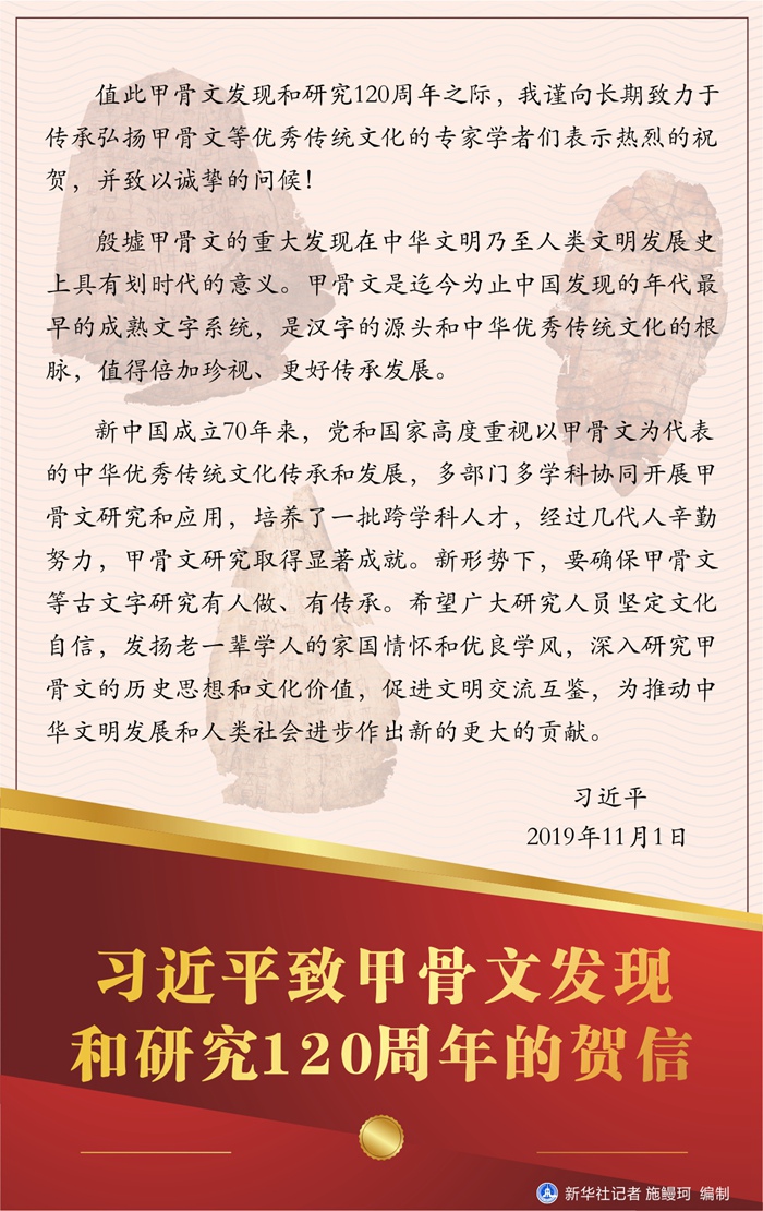 圖表:習(xí)近平致甲骨文發(fā)現(xiàn)和研究120周年的賀信 新華社記者 施鰻珂 編制