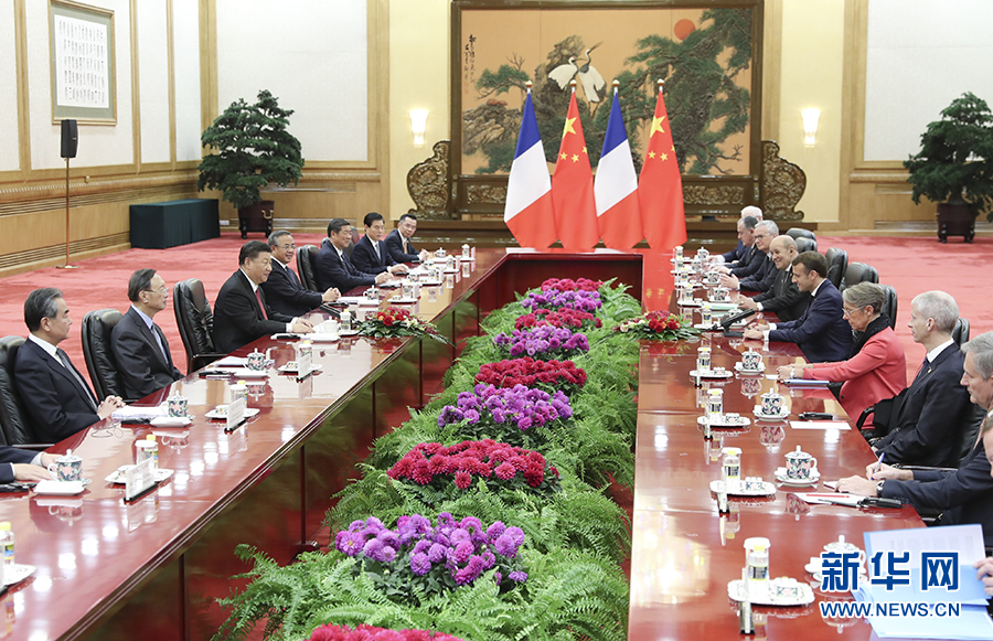 馬克龍表示,很高興在法中建交55周年之際再次訪華,我同習(xí)近平主席頻繁交往,深化了法中友誼和政治互信,有力推動(dòng)了務(wù)實(shí)合作。我完全贊同習(xí)近平主席對(duì)深化法中合作提出的看法。法中在許多重大國際問題上持有相同立場,在當(dāng)前國際形勢下,法中作為兩個(gè)大國,負(fù)有特別重要的責(zé)任,法國加強(qiáng)同中國的對(duì)話和合作,具有重要示范作用。對(duì)雙方之間的一些分歧,法方愿本著相互尊重的精神妥善處理。法國企業(yè)熱切期待抓住中國擴(kuò)大對(duì)外開放的契機(jī),進(jìn)一步進(jìn)入中國市場,擴(kuò)大對(duì)華農(nóng)產(chǎn)品出口,加強(qiáng)在航空、航天、民用核能等傳統(tǒng)領(lǐng)域合作,拓展科技創(chuàng)新、金融等領(lǐng)域合作。中方在法國發(fā)行歐元債券,這對(duì)法國具有重大意義。法方對(duì)中國企業(yè)赴法合作持開放態(tài)度,不會(huì)針對(duì)中國企業(yè)關(guān)上市場大門。法方愿推動(dòng)“一帶一路”同歐盟歐亞互聯(lián)互通戰(zhàn)略對(duì)接,共建綠色“一帶一路”。法中要擴(kuò)大人文交流,促進(jìn)文明互鑒。法中要共同維護(hù)多邊主義,在反恐、伊朗核等問題上加強(qiáng)戰(zhàn)略溝通協(xié)調(diào),推動(dòng)世貿(mào)組織改革早日取得進(jìn)展。法中將共同發(fā)表《法中生物多樣性保護(hù)和氣候變化北京倡議》,兩國可以在這些重要問題上發(fā)揮引領(lǐng)作用。在當(dāng)前充滿不確定性的世界里,歐盟深化對(duì)華合作至關(guān)重要,法方愿推動(dòng)歐中關(guān)系深入發(fā)展,加快歐中投資協(xié)定談判進(jìn)程。