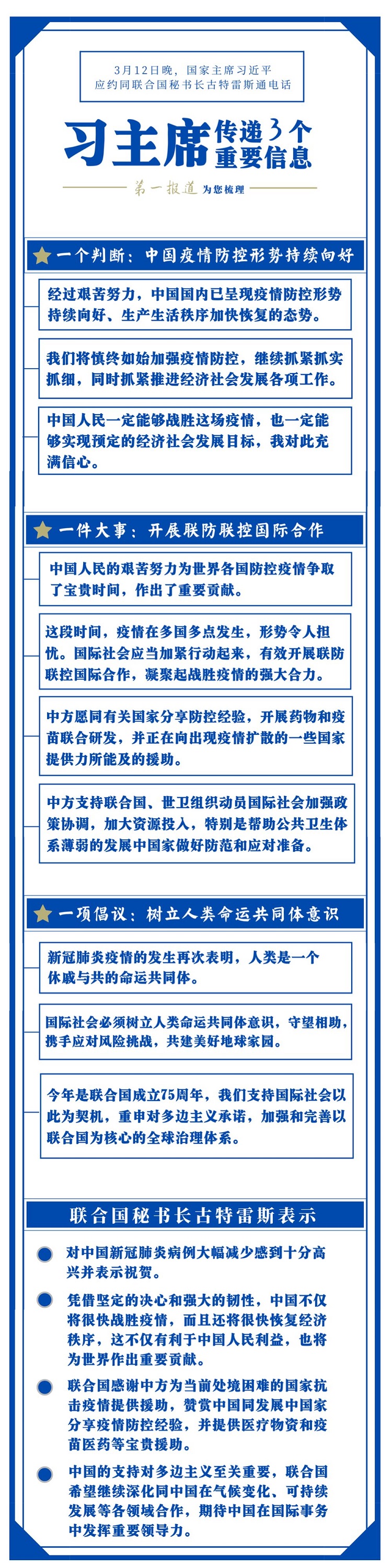 對疫情防控國際合作這件大事,習(xí)主席一直十分關(guān)心。此前,在內(nèi)外事活動中,他曾多次提及。這一次同古特雷斯通電話,習(xí)主席有更明確闡述。