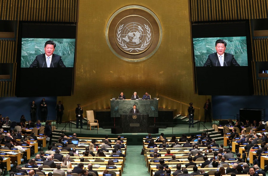 2015年9月28日,國家主席習(xí)近平在紐約聯(lián)合國總部出席第70屆聯(lián)合國大會一般性辯論并發(fā)表題為《攜手構(gòu)建合作共贏新伙伴 同心打造人類命運(yùn)共同體》的重要講話。新華社記者龐興雷攝