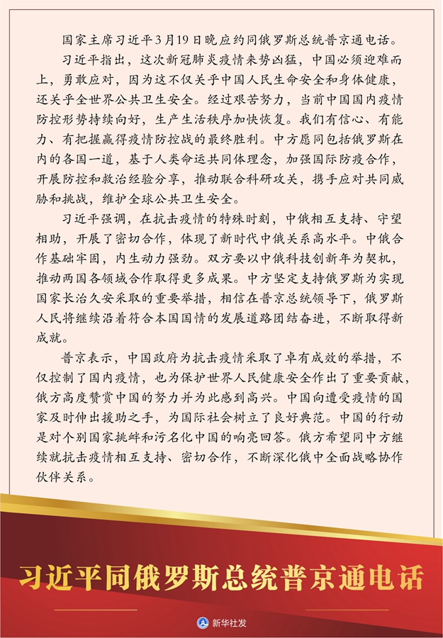 習(xí)近平指出,這次新冠肺炎疫情來勢(shì)兇猛,中國必須迎難而上,勇敢應(yīng)對(duì),因?yàn)檫@不僅關(guān)乎中國人民生命安全和身體健康,還關(guān)乎全世界公共衛(wèi)生安全。經(jīng)過艱苦努力,當(dāng)前中國國內(nèi)疫情防控形勢(shì)持續(xù)向好,生產(chǎn)生活秩序加快恢復(fù)。我們有信心、有能力、有把握贏得疫情防控戰(zhàn)的最終勝利。中方愿同包括俄羅斯在內(nèi)的各國一道,基于人類命運(yùn)共同體理念,加強(qiáng)國際防疫合作,開展防控和救治經(jīng)驗(yàn)分享,推動(dòng)聯(lián)合科研攻關(guān),攜手應(yīng)對(duì)共同威脅和挑戰(zhàn),維護(hù)全球公共衛(wèi)生安全。