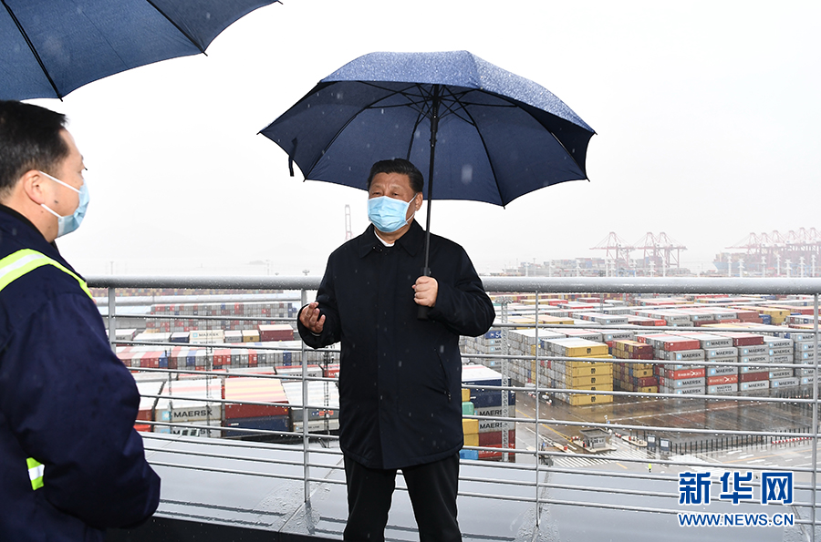 3月29日,中共中央總書記、國(guó)家主席、中央軍委主席習(xí)近平在浙江考察調(diào)研。這是習(xí)近平在寧波舟山港穿山港區(qū)碼頭了解港口復(fù)工復(fù)產(chǎn)情況。 新華社記者 燕雁 攝