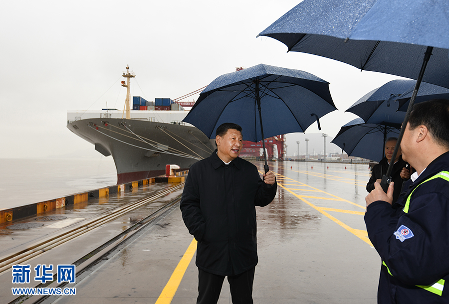 3月29日,中共中央總書記、國家主席、中央軍委主席習近平在浙江考察調(diào)研。這是習近平在寧波舟山港穿山港區(qū)碼頭了解港口復工復產(chǎn)情況。 新華社記者 申宏 攝
