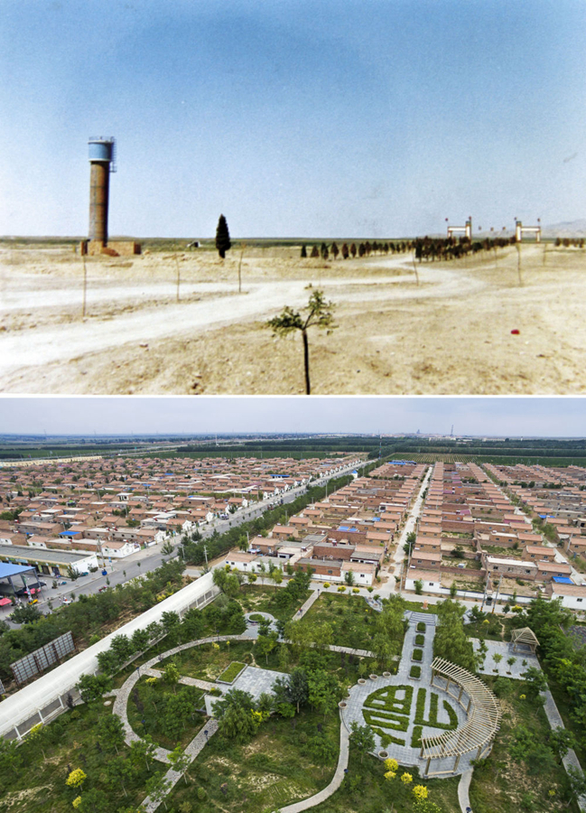 拼版照片:上圖為寧夏永寧縣閩寧鎮(zhèn)建設初期的鄉(xiāng)鎮(zhèn)雛形(資料照片);下圖為俯瞰寧夏永寧縣閩寧鎮(zhèn)原隆移民村(2016年7月22日攝,新華社記者 王鵬攝)
