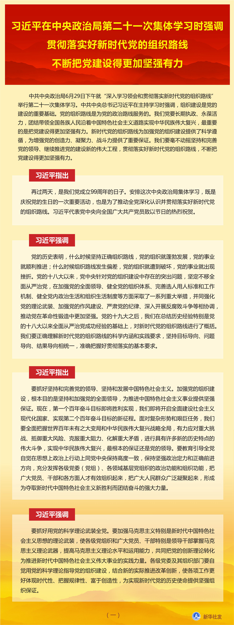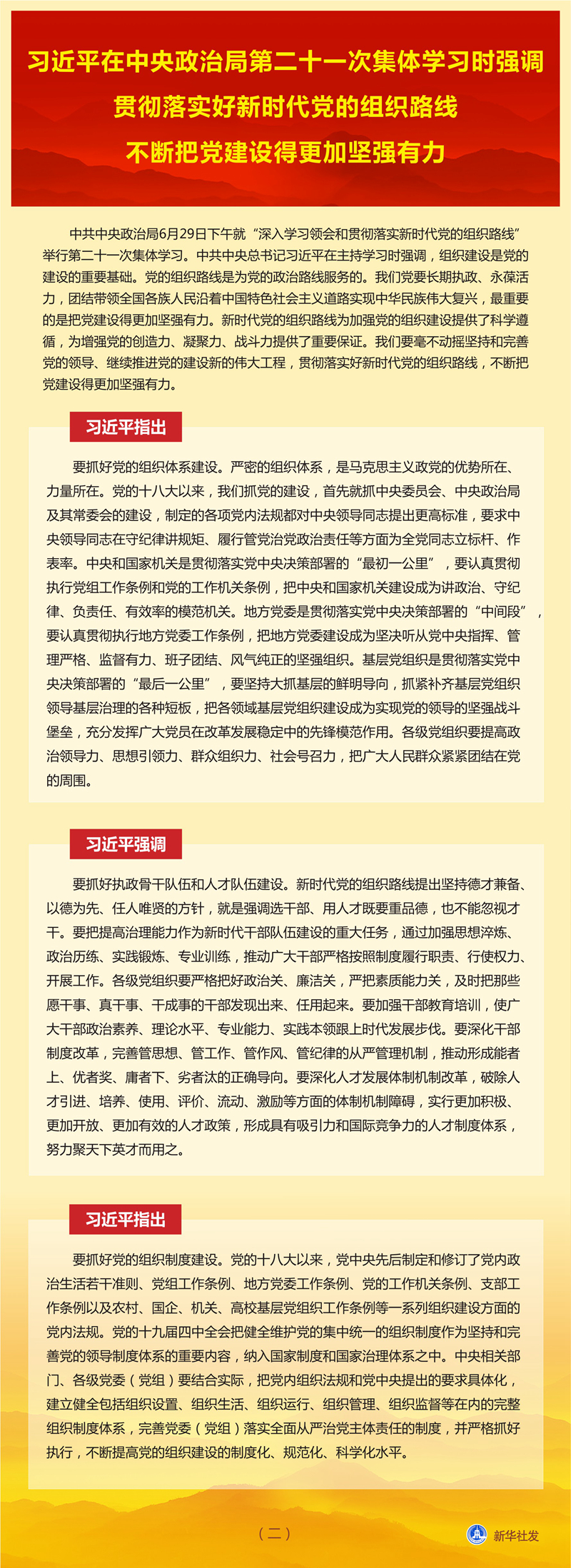 新華社北京6月30日電 中共中央政治局6月29日下午就“深入學習領(lǐng)會和貫徹落實新時代黨的組織路線”舉行第二十一次集體學習。中共中央總書記習近平在主持學習時強調(diào),組織建設(shè)是黨的建設(shè)的重要基礎(chǔ)。黨的組織路線是為黨的政治路線服務(wù)的。我們黨要長期執(zhí)政、永葆活力,團結(jié)帶領(lǐng)全國各族人民沿著中國特色社會主義道路實現(xiàn)中華民族偉大復興,最重要的是把黨建設(shè)得更加堅強有力。新時代黨的組織路線為加強黨的組織建設(shè)提供了科學遵循,為增強黨的創(chuàng)造力、凝聚力、戰(zhàn)斗力提供了重要保證。我們要毫不動搖堅持和完善黨的領(lǐng)導、繼續(xù)推進黨的建設(shè)新的偉大工程,貫徹落實好新時代黨的組織路線,不斷把黨建設(shè)得更加堅強有力。