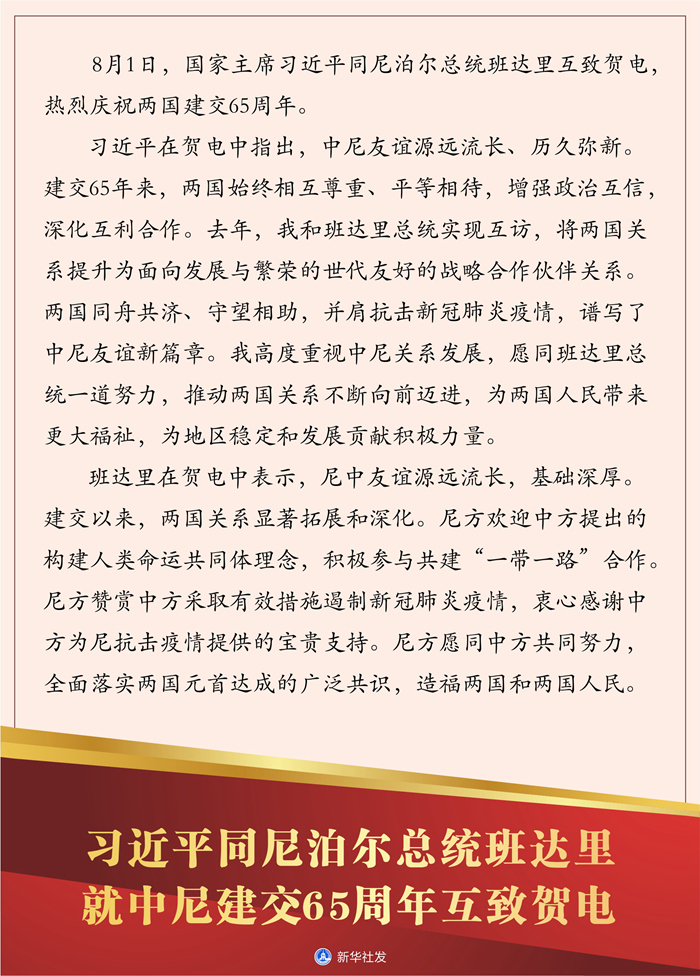 習(xí)近平在賀電中指出,中尼友誼源遠(yuǎn)流長、歷久彌新。建交65年來,兩國始終相互尊重、平等相待,增強政治互信,深化互利合作。去年,我和班達(dá)里總統(tǒng)實現(xiàn)互訪,將兩國關(guān)系提升為面向發(fā)展與繁榮的世代友好的戰(zhàn)略合作伙伴關(guān)系。兩國同舟共濟、守望相助,并肩抗擊新冠肺炎疫情,譜寫了中尼友誼新篇章。我高度重視中尼關(guān)系發(fā)展,愿同班達(dá)里總統(tǒng)一道努力,推動兩國關(guān)系不斷向前邁進,為兩國人民帶來更大福祉,為地區(qū)穩(wěn)定和發(fā)展貢獻積極力量。