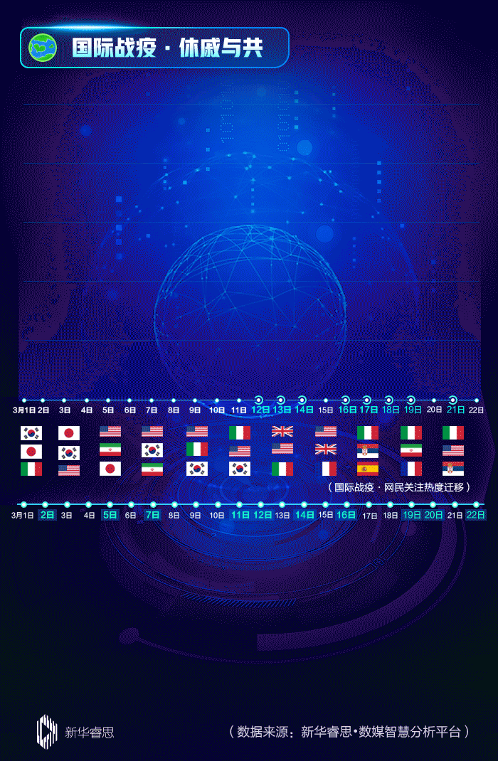 患難見(jiàn)真情。中國(guó)以實(shí)實(shí)在在的行動(dòng),支援全球抗疫:派遣專家、交流經(jīng)驗(yàn)、共享方案、捐贈(zèng)物資、聯(lián)合研發(fā)……一個(gè)又一個(gè)“硬核”舉措,引發(fā)網(wǎng)友高度關(guān)注。新華睿思數(shù)據(jù)顯示,中國(guó)派專家組馳援意大利、多國(guó)開(kāi)建“方艙醫(yī)院”等新聞事件,在關(guān)注度曲線上產(chǎn)生較高波動(dòng)。與此同時(shí),網(wǎng)友持續(xù)關(guān)注著韓國(guó)、日本、意大利、美國(guó)、伊朗、西班牙等國(guó)疫情進(jìn)展。